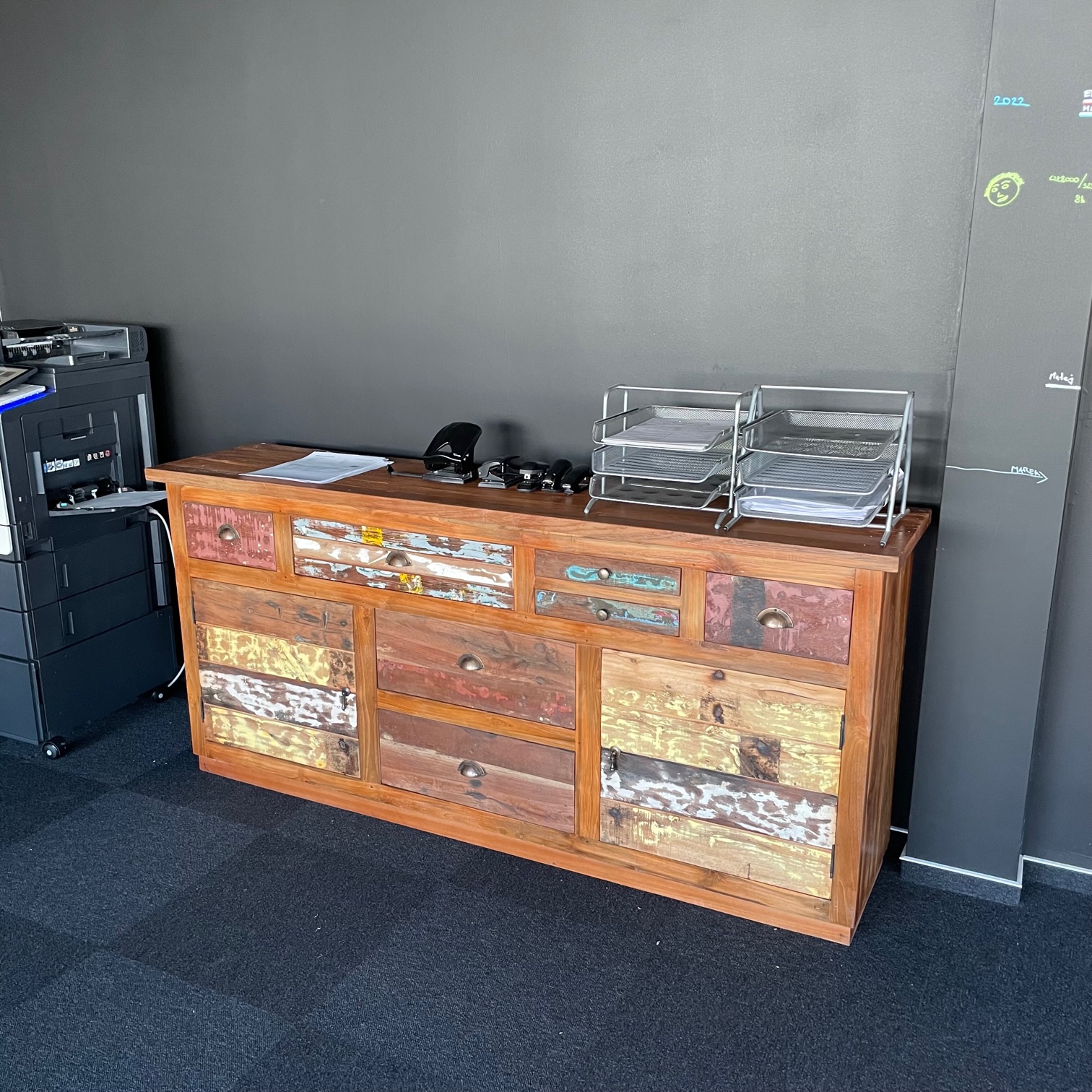 Aparador rústico e artesanal em madeira reciclada, com 9 gavetas e acabamentos únicos. Uma peça cheia de personalidade para quem valoriza o design sustentável.
