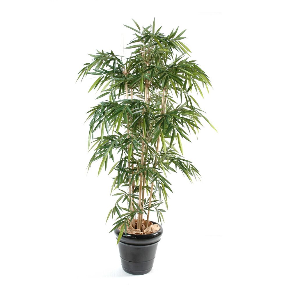A Árvore Bambu artificial Largo, com 150 cm de altura e 90 cm de largura, é uma opção elegante para a sua decoração, apresentando folhagem em TERGAL e um vaso de PVC.