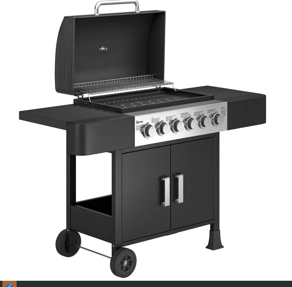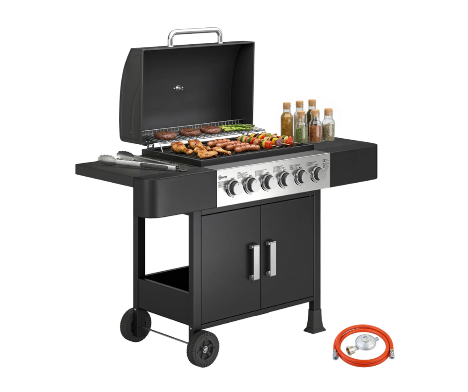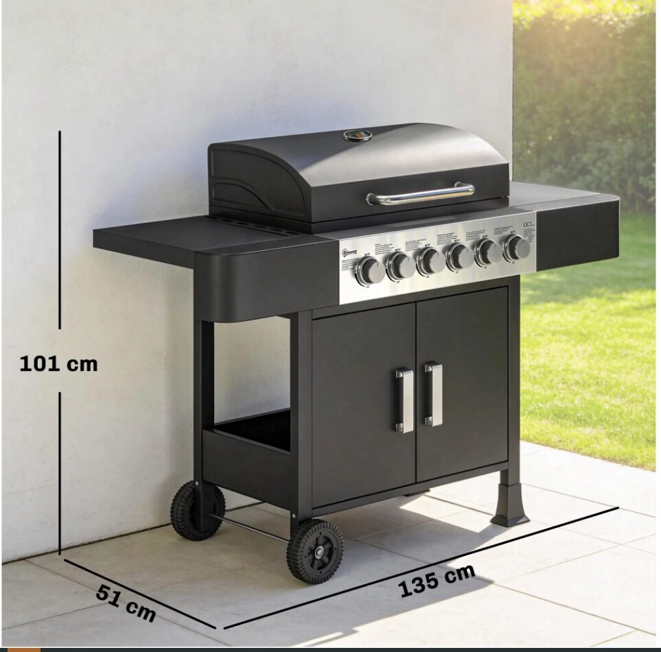 Barbecue a gás com 6 queimadores e potência total de 15 kW, ideal para preparar refeições ao ar livre com controlo individual da temperatura em cada zona de cozedura. Inclui tampa com termómetro integrado, duas prateleiras laterais de apoio e armário inferior para arrumação de utensílios. Funciona a gás butano ou GPL e já inclui regulador e mangueira.