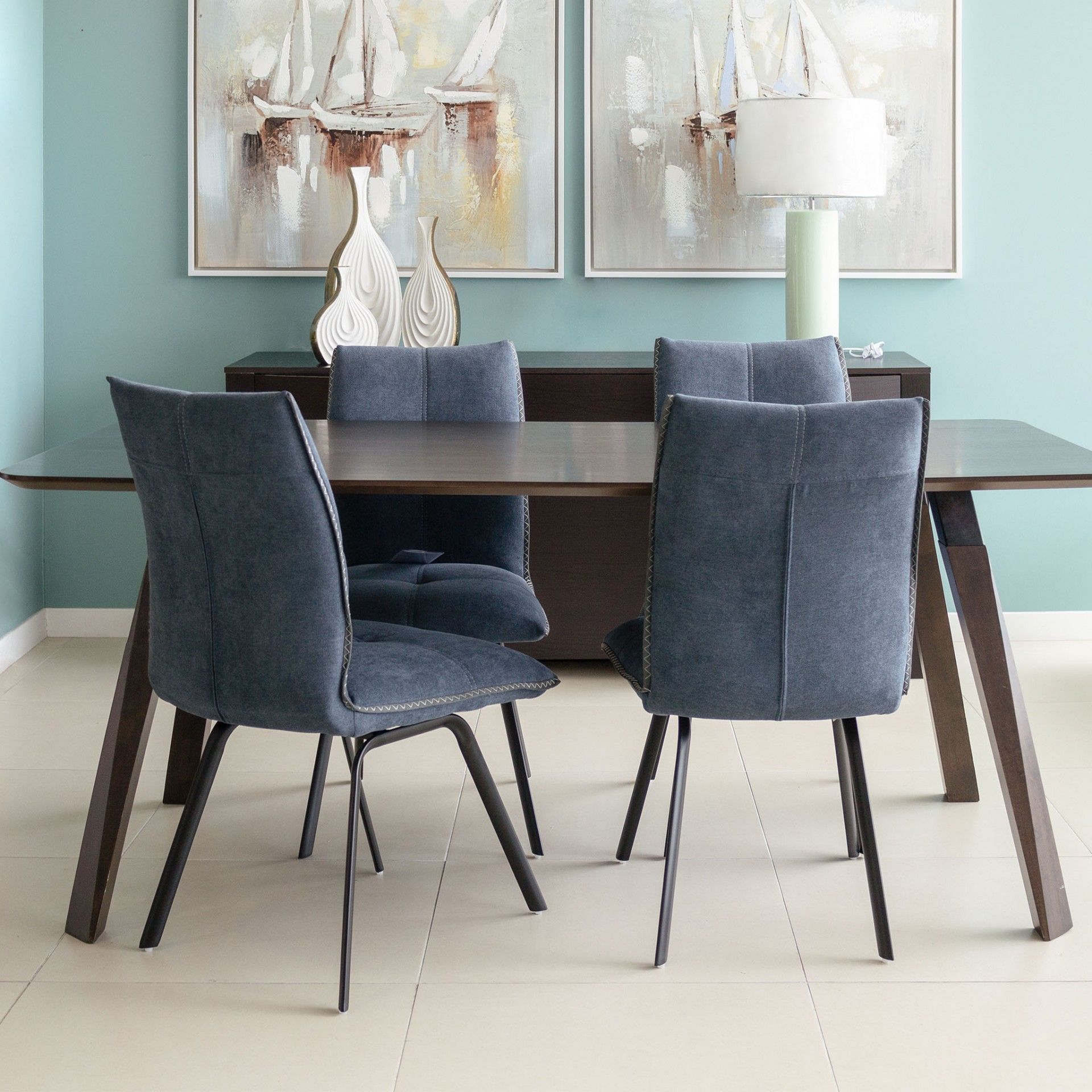 Cadeira estofada, revestida a tecido de cor azul.