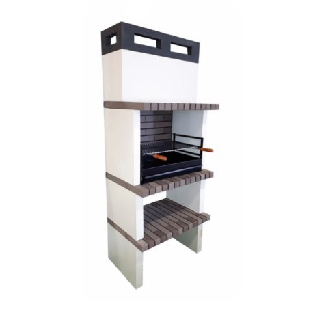A churrasqueira conta com prateleira inferior em tijolo cinza e zona de fogo e bancadas igualmente em tijolo, garantindo estabilidade e resistência ao calor. Além disso, o sistema de chaminé integrado melhora a extração de fumos, tornando o ambiente mais agradável durante o churrasco.