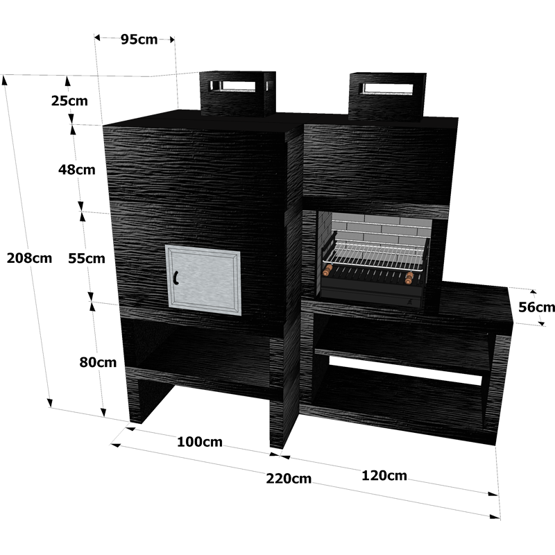 O conjunto CFM12 – Churrasqueira com extensão + Forno possui medidas de L220 x A208 cm e peso total de 1995 kg. Graças às suas dimensões, oferece uma ampla área de preparação e cozimento. Inclui uma churrasqueira principal com extensão, perfeita para diferentes tipos de alimentos, além de um forno espaçoso com diâmetro interior de 80 cm, ideal para assar pizzas, pães e outros pratos caseiros.
