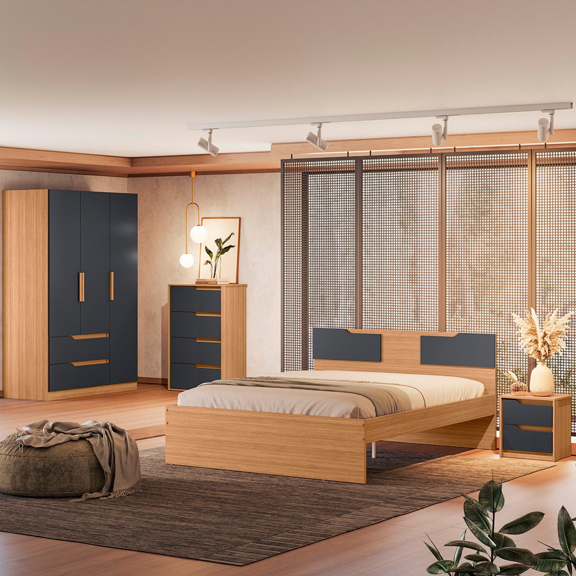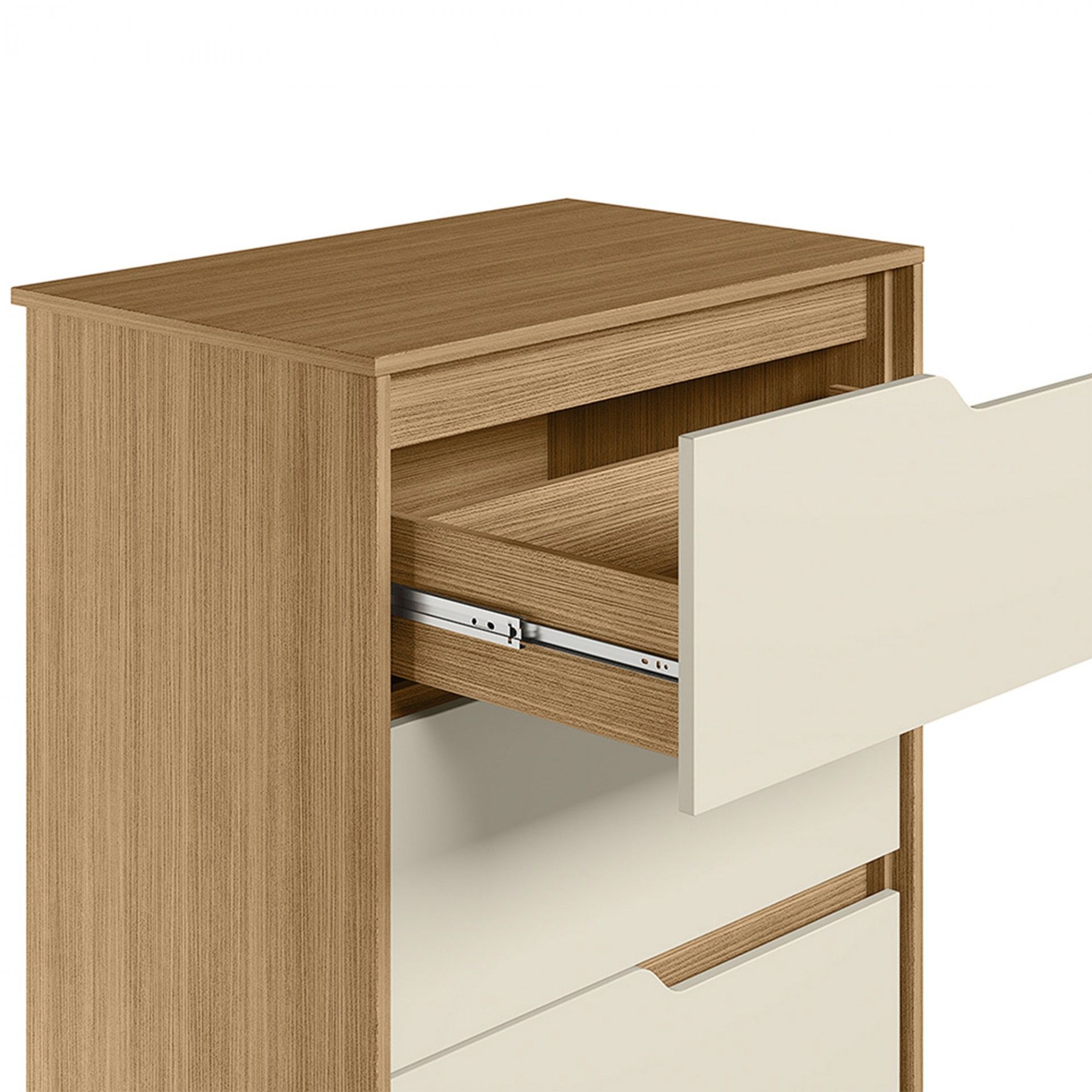 A coleção Evo para organizar coisas é versátil e encaixa-se em vários estilos decorativos. Tem um design moderno e simples, com uma estrutura em tom de carvalho. As gavetas têm cores neutras e puxadores embutidos atraentes, que são a marca registrada desta coleção.