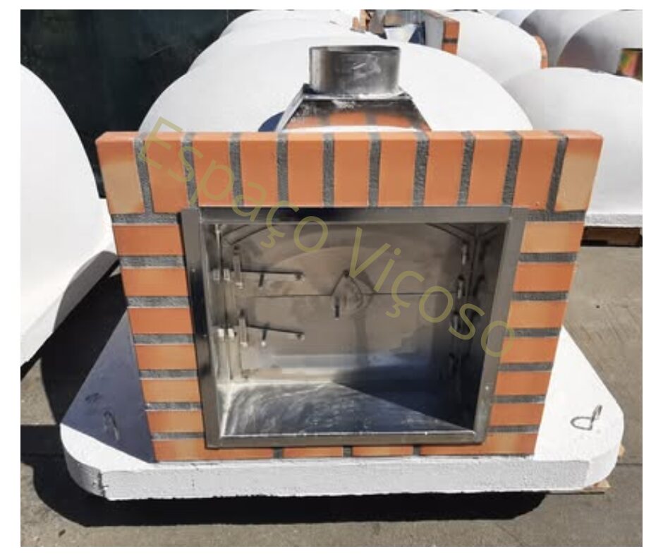Está disponível em acabamento de tijolo vermelho, laranja ou cinza e oferece porta em inox, ideal para libertar fumos e aumentar a durabilidade.