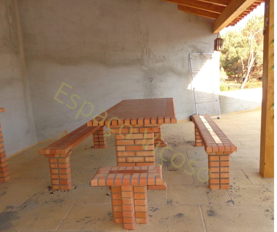Mesa e bancos em tijolo com mosaico para exterior ou zona de convívio