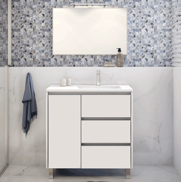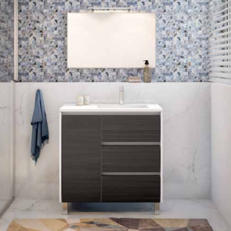 - L80 x A81 x P45 cm: Estrutura com 1 porta e 3 gavetas, Lavatório à Direita.