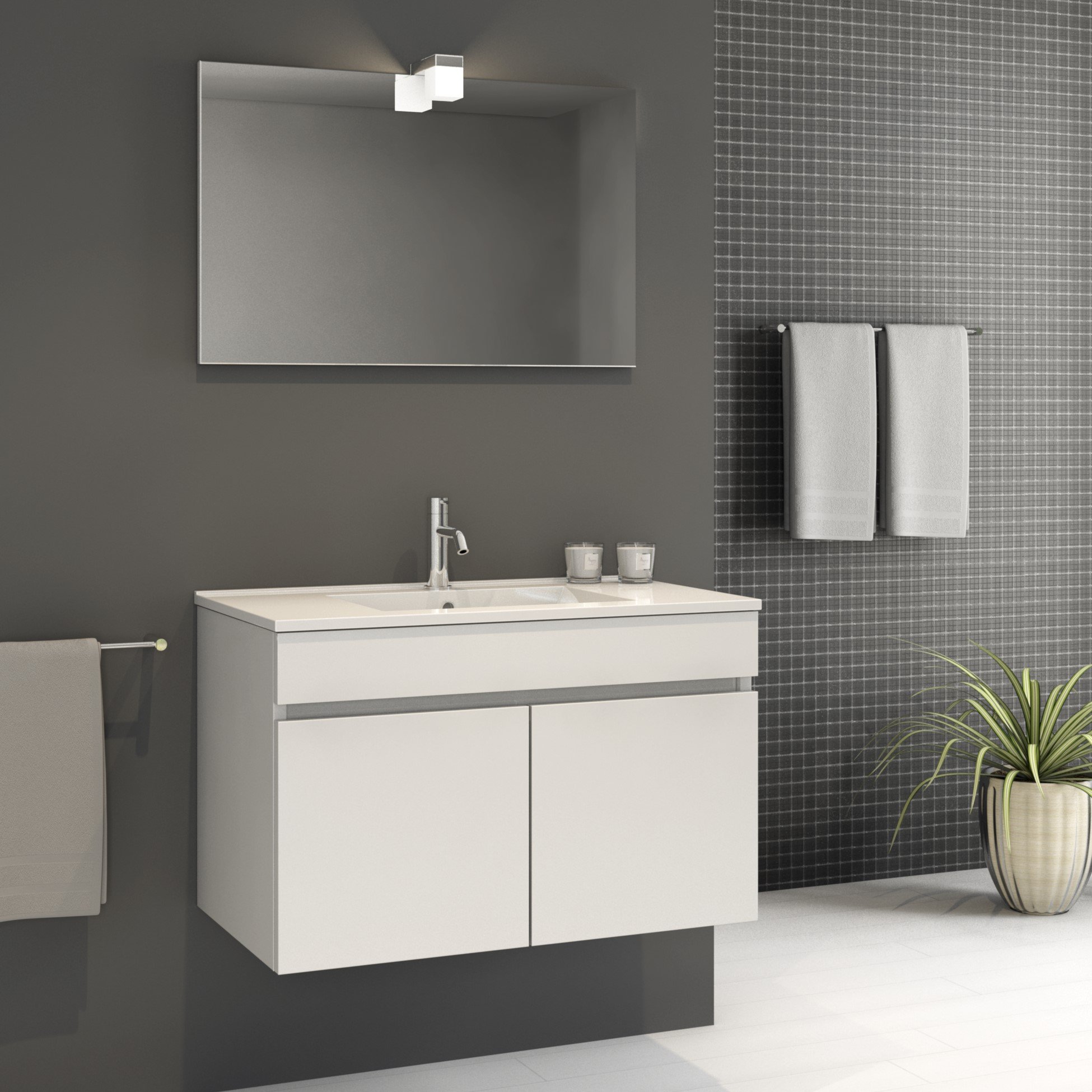 Móvel suspenso fundo reduzido + lavatório encastrado (cerâmico) ao centro para casa de banho, modelo Porto.