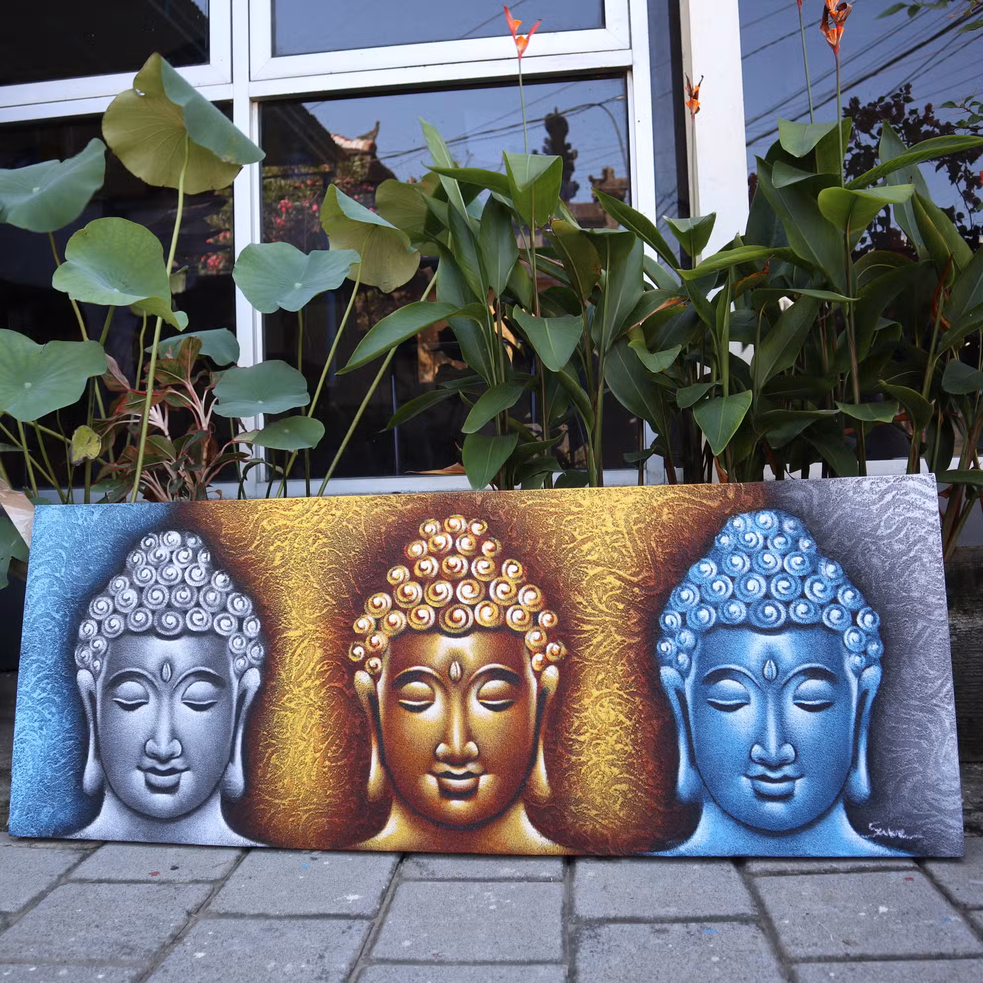 Esta pintura representa três faces de Buda que simbolizam equilíbrio e consciência. Por isso, é uma escolha perfeita para ambientes dedicados ao relaxamento e bem-estar. Ao mesmo tempo, o acabamento em dourado cria contraste e luminosidade, tornando o espaço mais acolhedor e visualmente harmonioso.