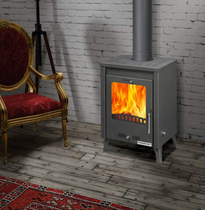 Com 7,8 kW de potência, combustão dupla e rendimento de 77%, aquece divisões médias de forma rápida e económica.